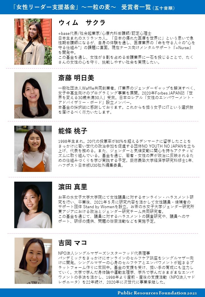 2021年度は20歳~64歳と幅広い年齢層から137名の応募があり、厳正なる審査の結果、様々な分野でリーダーを目指す5名の女性が選出されました。
