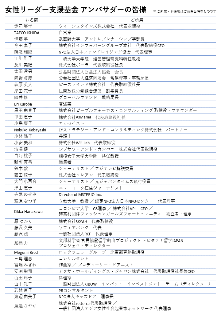 女性リーダーをともに育成することで、日本における女性の社会的地位向上を一緒に実現しましょう!!皆様の応援をお待ちしております。