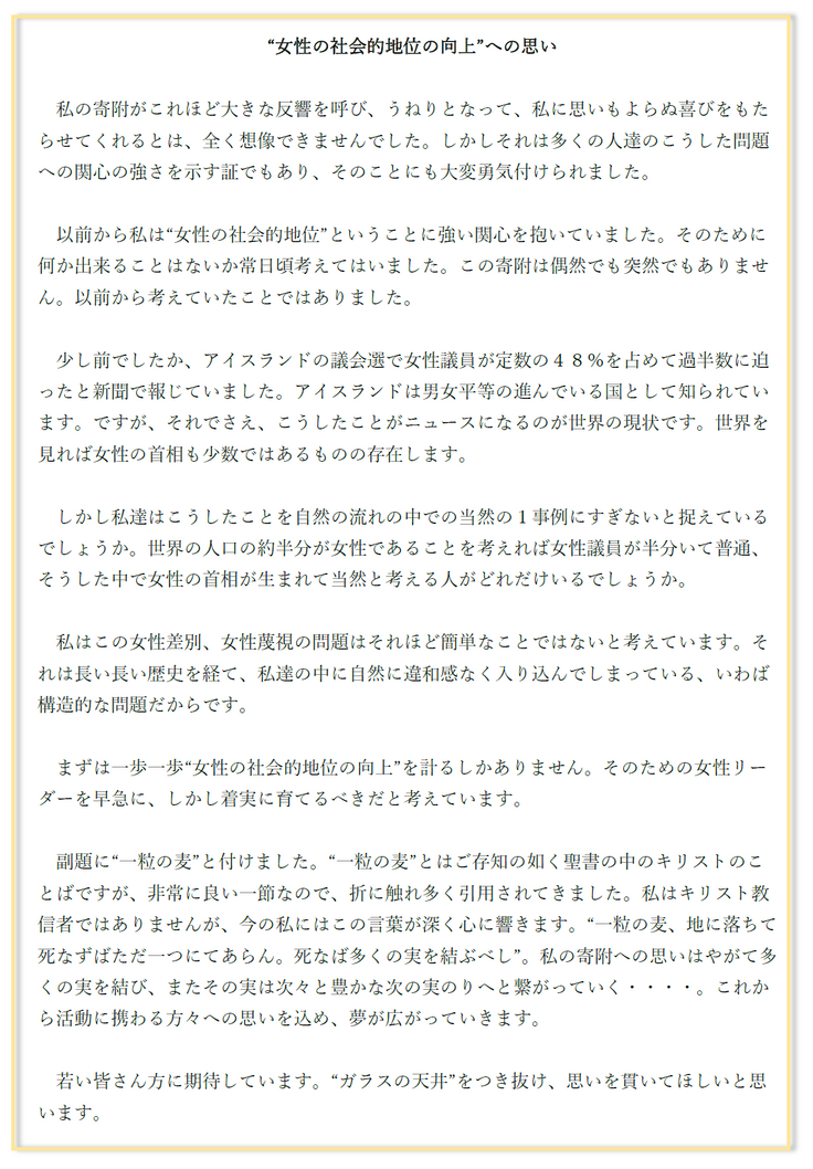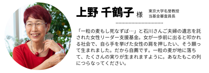 ※本基金の副題「~一粒の麦~」とは、一粒の麦は地に落ちることによって無数の実を結ぶという聖書の言葉か ら、女性の社会的地位向上に自ら一石を投じたいという石川さんの思いを表しています。