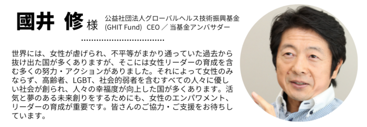 國井修氏(公益社団法人グローバルヘルス技術振興基金(GHIT Fund)CEO)を講師にお迎えし、「次世代女性リーダーとして、グローバルな視点から聞いてみたいテーマに応える講義」というテーマのもと、支援対象者・応募者・寄付者の皆様を中心に多くの女性リーダーを目指す方々にご参加いただきました!