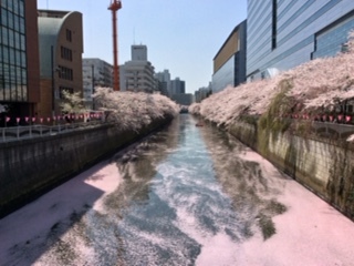 事務所近くの目黒川も、花のピークは過ぎましたが、水面に美しい花筏(はないかだ)が流れていました。