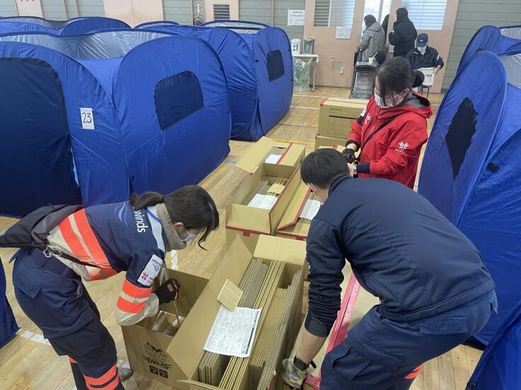 その日の夜「段ボールベッドが届いたので、空飛ぶ捜索医療団さんに設置のお手伝いをお願いしたい」と連絡を受け、翌日の午前中に設営をサポートするために空飛ぶ捜索医療団のスタッフがふたたび避難所を訪れました。
