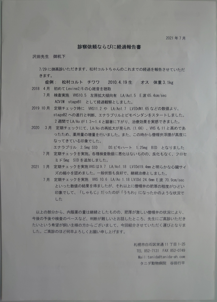 ※かかりつけ医から心臓病に詳しい動物病院への診察依頼・経過報告書です。病気の進行について詳しく書かれています。