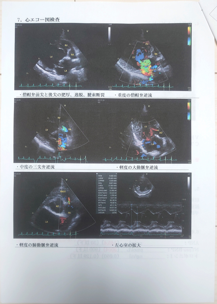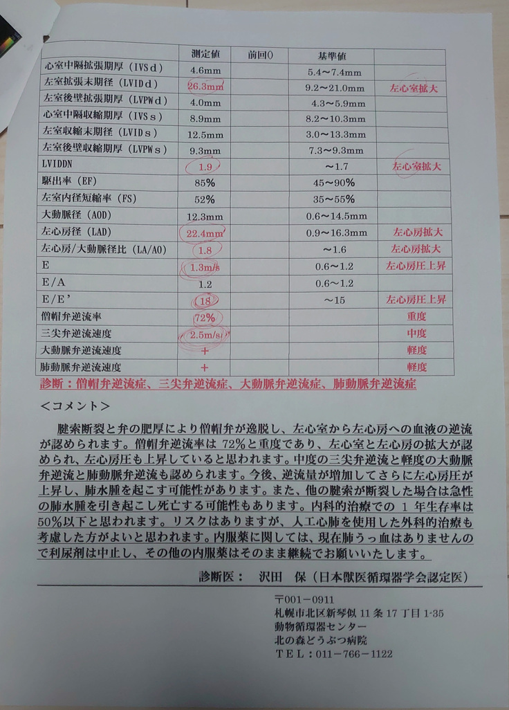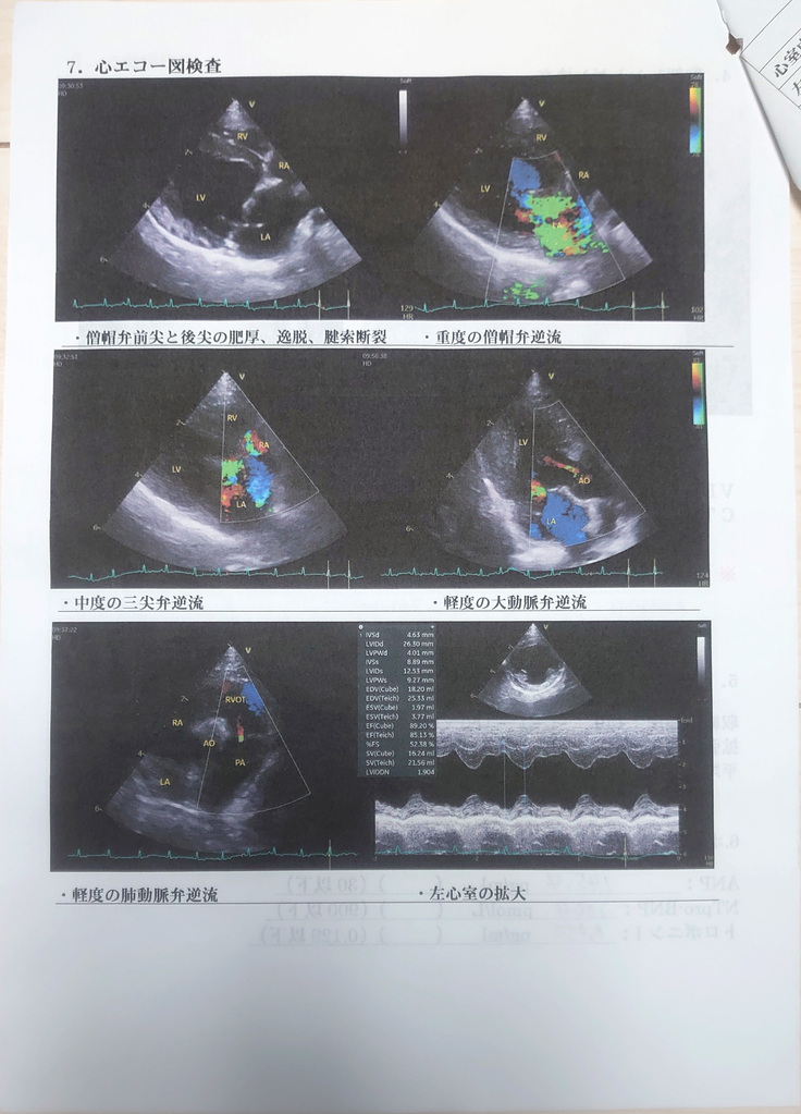心臓手術を受けられる動物病院を紹介していただき、再度心臓の検査をしてもらったところ、僧帽弁逆流率は72%と重度、今後逆流量が増加してさらに左心房圧が上昇し肺水腫を起こす可能性がある。また他の腱索(心臓の弁と左心室壁を繋ぐ組織)の断裂が進行した場合は急性の肺水腫を引き起こし死亡する可能性もあり、現在行っている内科的治療の継続での1年生存率は50%以下だと担当医より告げられました。
