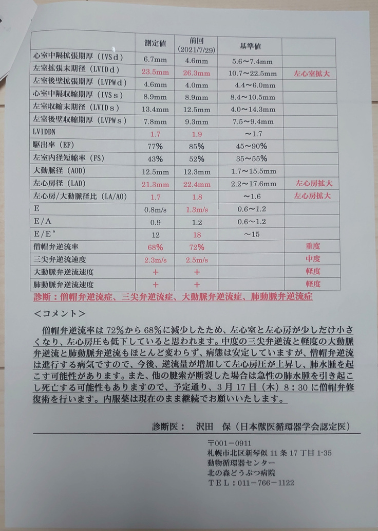 2022年2月に手術前の心臓チェックを行い、7月のチェック時よりも逆流率が減少(72%→68%)し、左心室と左心房が少しだけ小さくなり左心房圧も低下。病態は安定していますが僧帽弁逆流は進行する病気なので、致命的な発作を起こす前に予定通り僧帽弁修復術を行うこととなりました。