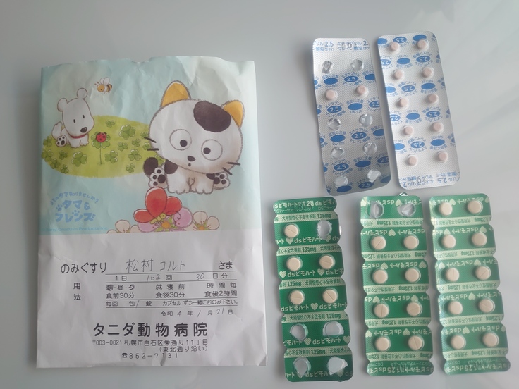 ※現在、エナラプリル1錠(夕1錠)とピモベンダン2錠(朝夕1錠)を毎日欠かさず飲んでいます。
