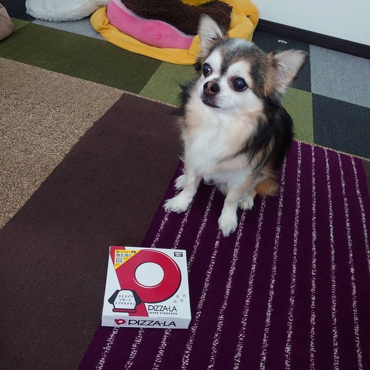 ↑誕生日にワンちゃん用のピザをもらうコルト。「待て」の間は食べ物から目をそらして必死で待ちます。
