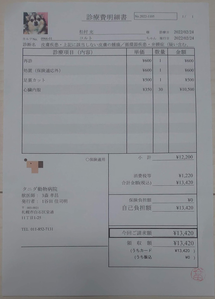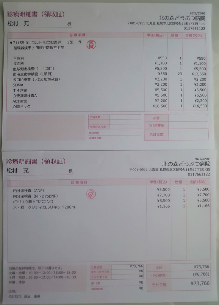 ↑直近の心臓検査・血液検査にかかった費用明細です。
