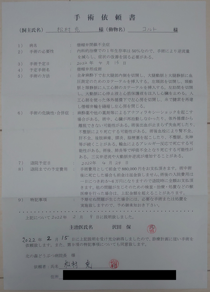 この小さい身体にこんな大手術を受けさせることは果たしてコルトにとって幸せなことなのか、とも考えました。幸いなことにまだ肺水腫を起こしたことがなく、心臓以外の臓器はとても健康な状態にあります。僧帽弁修復術の成功率は90%で手術中や術後の合併症など危険を伴いますが、他の臓器が健康な状態にあることはプラスだと言われました。
