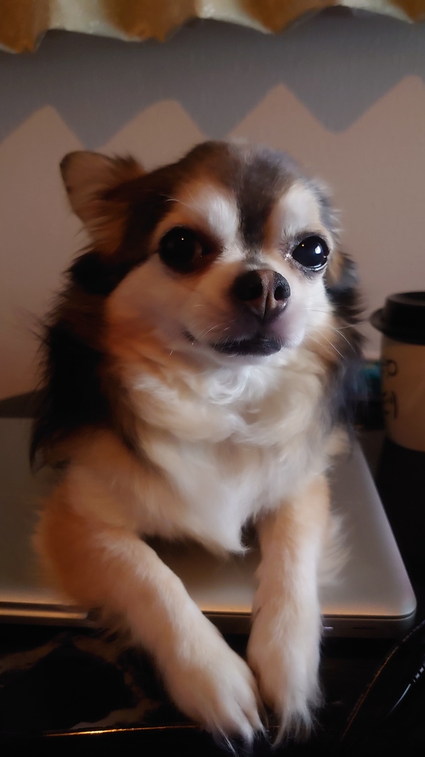 ノートパソコンに乗って仕事の邪魔をするコルト。私が何かに集中していると、たまにこうやって自分を見てアピールをしてくることがあります。たまらなく可愛い!