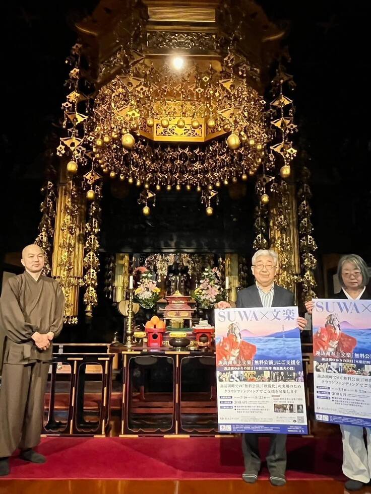 大好評を得た初回に続き、昨年は同寺にて第2回目の公演、そして今年はいよいよ物語の舞台となる諏訪湖畔の屋外ステージでの無料公演を計画しています(SUWA×文楽2024 公式WEBサイト参照)。実現のためには、皆さまのご協力が欠かせません。どうか熱いご支援をSUWA×文楽クラファンサイトにお寄せ下さい。