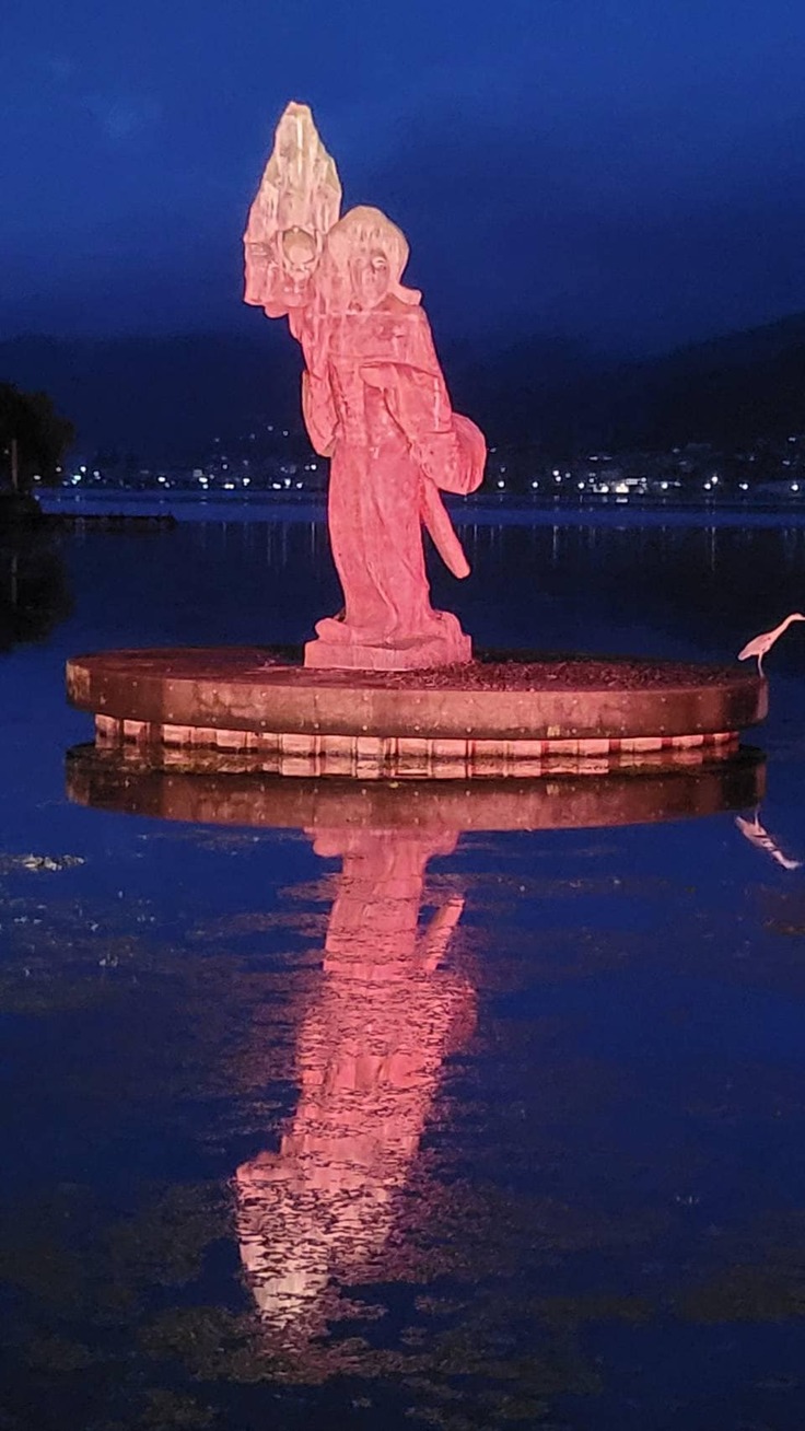 本プロジェクトのきっかけの一つは、諏訪湖畔(実は「片倉館」沖の湖中!)にある「八重垣姫ブロンズ像」ですが、7月13日・14日にプロジェクト協力団体でもある「諏訪塾」主催によるライトアップイベントが行われました。誰もが初めて見る八重垣姫像の幻想的な姿を写真でご覧ください。