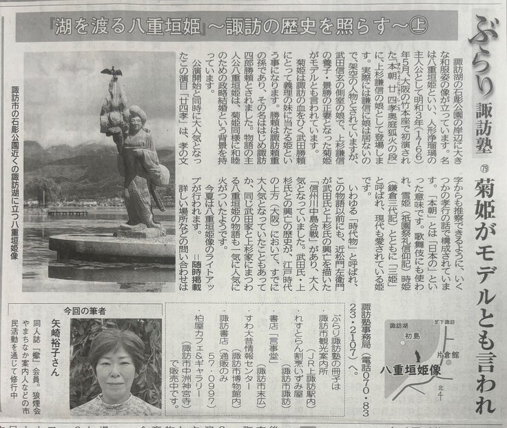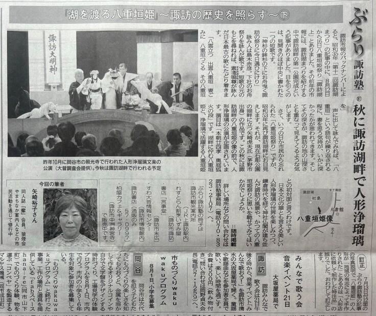 時代の流れとともに、いつしかこうした経過も八重垣姫の人気も次第に人々の記憶から薄れつつあったのかもしれませんが、今回諏訪湖ステージで奉上される「本朝廿四孝奥庭狐火の段」により、再び主人公・八重垣姫にスポットが当たりつつあるのです。長野日報に掲載された参考記事「ぶらり諏訪塾」(『湖を渡る八重垣姫~諏訪の歴史を照らす~上・中・下』)もご参照ください。
