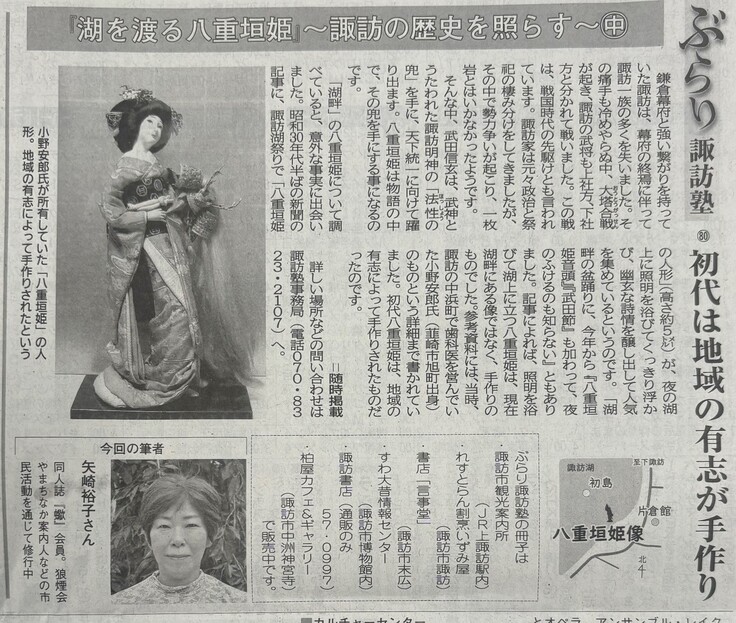 この像は彫刻家・矢崎虎夫の作ですが、像がこの地に設置された経過も少しずつ分かってきました。昭和30年代半ばに地元・中浜町の有志が手づくりで高さ5m以上の大きな八重垣姫の人形を毎年製作し、湖畔で開催された「諏訪湖祭り(湖上花火大会など)」では、夜の湖中に人形が浮かべられ照明を浴びて幽玄な詩情を醸し出していたのです(昭和35年の「南信日日新聞」記事など)。又この大きな八重垣姫人形のモデルとなった日本人形の「八重垣姫」は、当時中浜町で歯科医を開業されていた小野安郎氏の所蔵品だったことも判明しました。昭和30年代後半には「湖畔の八重垣姫人形」は広く市民にも知られ愛されていたのです。この流れを受けて、昭和53年には現在のブロンズ像が湖中に設置されたという経過だったようです。翌年には「八重垣音頭」もレコードで登場して湖畔での盆踊りにも加えられ、八重垣姫は諏訪市民によく知られる伝説の姫君として定着していったと思われます。