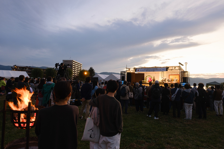 公演は公益社団法人諏訪圏青年会議所主催「諏訪圏フォーラム2024」のメインフォーラムとして行なわれました。会場となった諏訪市湖畔公園ではトークイベントやライブが行われ、キッチンカーや諏訪地域の食と魅力を発信するブース出店もあり、多くの人で賑わいました。