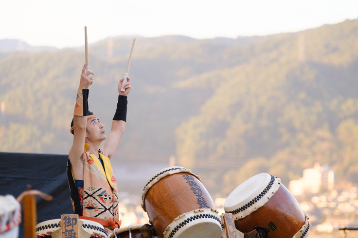 御諏訪太鼓伝承者・山本麻琴さんが登場。一打一打に魂がこもっていて、諏訪湖と空と大地が共鳴するような神々しい音が響き渡ります。勇壮で力強い御諏訪太鼓は、神への奉納や地域の伝統を象徴するものでもあり、人々の心を一つにする目的や、地域の誇りとしても重要な存在になっています。観客の体温も一気に上がるような轟に、西陽が輝き出し、諏訪湖東岸を照らし出しました。