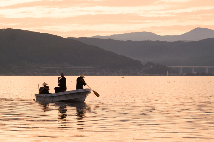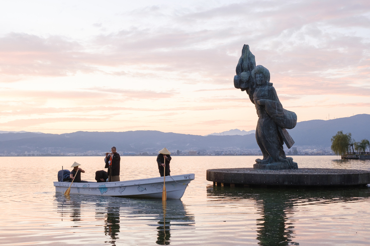 17時。茜が差し始めた湖面を一艘の小舟が篠笛の音色と共に渡ってきます。竹笠の船頭が漕ぐ小舟の上にすっと立つ奏者は八劔神社の宮坂清宮司。八劔神社は諏訪湖の御神渡り神事を司どる神社で、宮坂宮司は毎年小寒から立春まで毎朝諏訪湖に降り立ち、凍り具合を拝観されます。篠笛の美しい音色は静かに湖面を渡り、場が清められていくようです。雲は払われ、美しい夕焼けが空と湖を染めて湖上の八重垣姫の像を浮かび上がらせます。