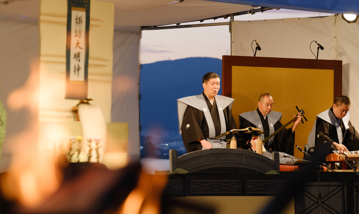 16時30分、篝火が灯り、義太夫の豊竹芳穂太夫が登場。文楽では物語を語り進める太夫が一人で多くの登場人物を声色や抑揚を変えながら演じ分け、言葉と声の力で鮮やかに情景を再現します。芳穂太夫がその演じ分けを実演しながら解説してくださいました。諏訪湖に響き渡る艶のある声が七変化!お見事でした!