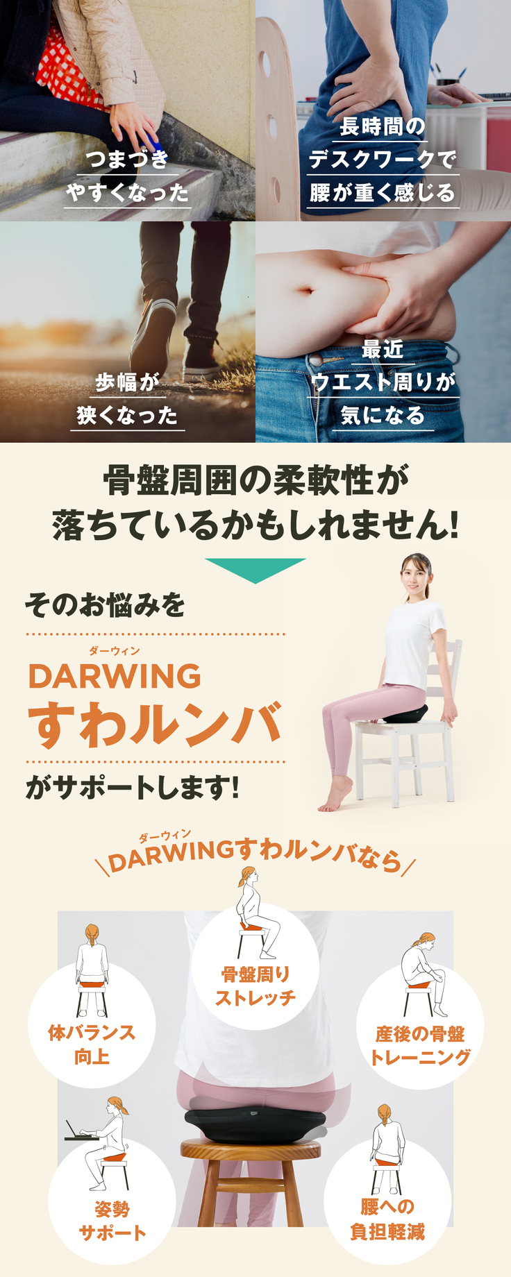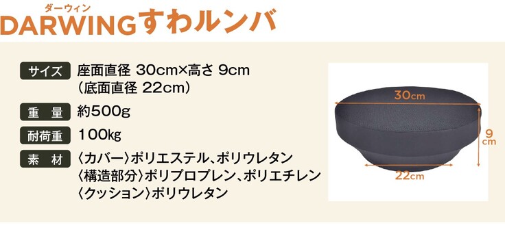 ・DARWING(ダーウィン)すわルンバは、座って使用し腰部をストレッチするためのクッションです。目的以外の使用はお避けください。