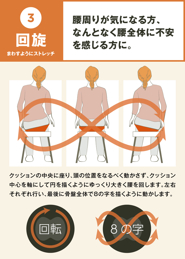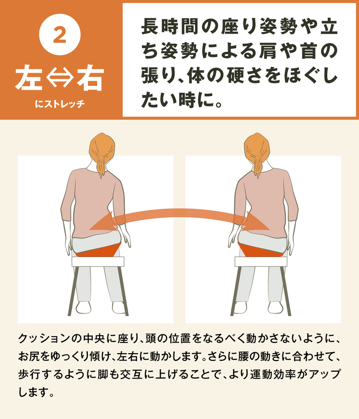 仕事中やTVを見る時も座って骨盤を動かすことで、簡単にストレッチができ、「ながら運動」の習慣づくりが期待できます。