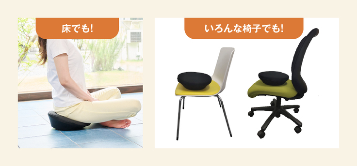 空気を膨らませる一般的なバランスボールに比べ省スペースで、ダイニングチェアやオフィスチェアなど椅子を選ばずどんな座面にも置いて使用できます。
