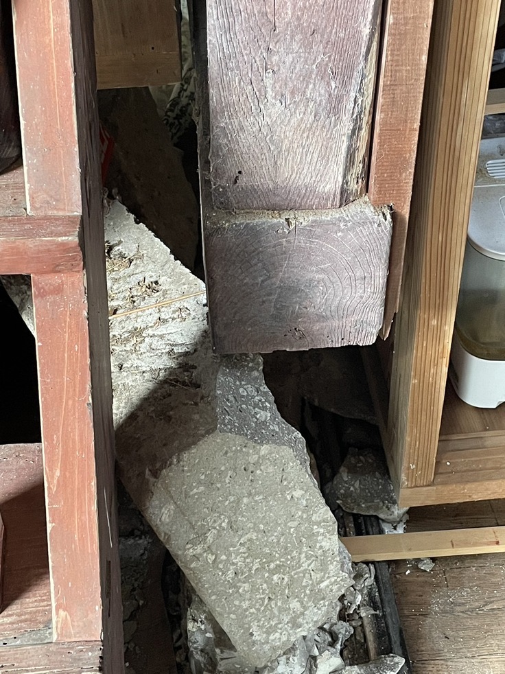 けれど、足元の床と地面が割れ、その裂け目に柱の束石が消えていきました。