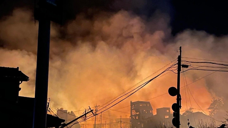 その日の夜の輪島の空は赤く、有名な朝市通りは絶え間なく燃えていました。