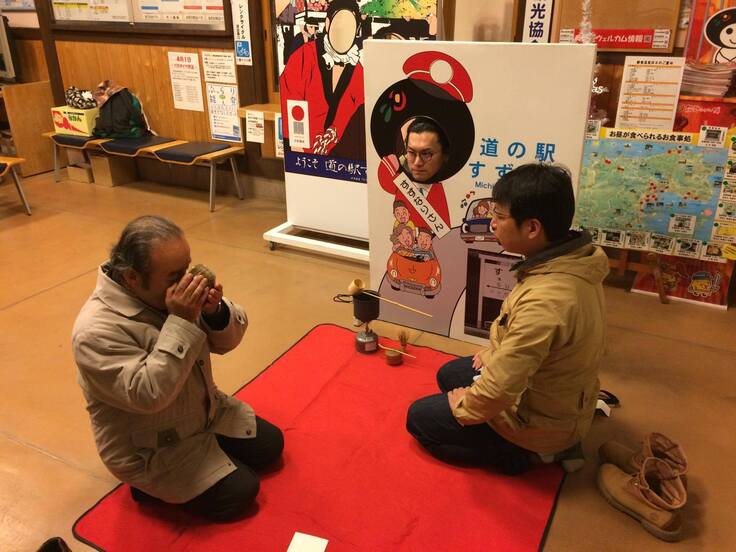 備前焼ミュージアムの臼井洋輔 館長(当時)が、企画展の打ち合わせのために珠洲へお見えになるということで行ったサプライズのウェルカム茶会。備前から7時間の長旅の後、バスから降り、我々の茶席を見ての第一声は「粋だねえ~」の一言。その後、待合にいたおばあちゃんと高校生カップルにも一服差し上げました。