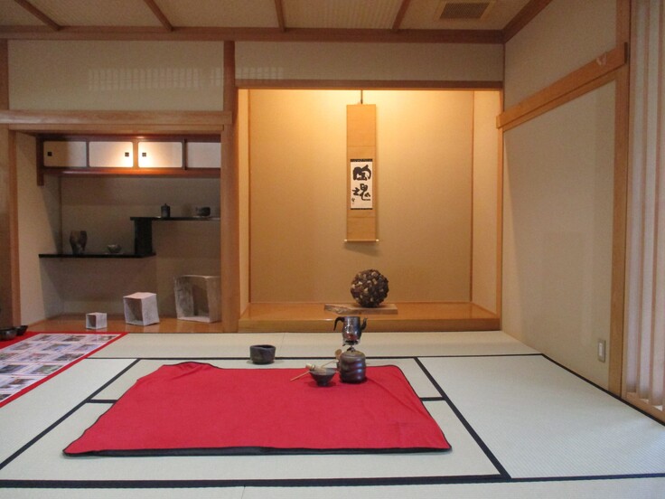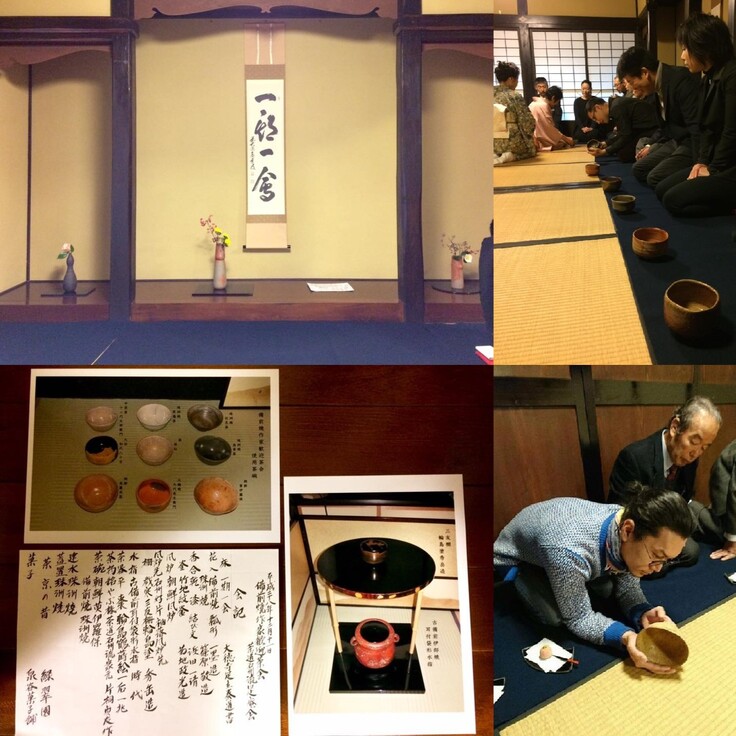 珠洲焼作家の皆さんによる粋な計らいで、石州流宗家・椿原宗薫先生がお茶会を開いてくださいました。花入や茶盌、蓋置など珠洲焼と備前焼を使っていただいての一服。お茶を通しての交流から多くの気づきを得ることができました。