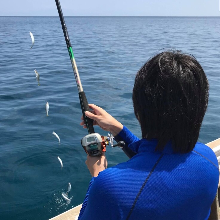お茶会後は入れ食い状態のアジ釣り。「輝丸」では、絶景スポットをクルージングするだけでなく、カモメにエサをあげたり、釣りを楽しんだりと珠洲の海を全力で満喫できます。