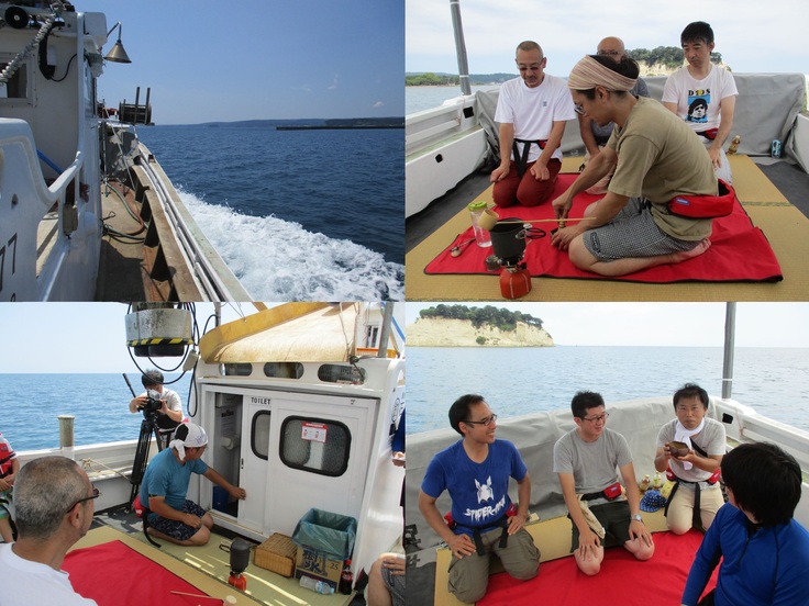 キャラバン茶の海上デビューは、浜本一昭さんの操舵する「輝丸」にて。珠洲のシンボル「見附島」をバックに、滞在でお世話になった方々へ、お茶をふるまわせていただきました。船には畳も準備していただき、万全の体制。トイレからの登場はいかがなものかという声もあがりましたが…。