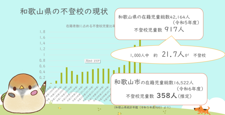 令和5年度には、児童1000人中、約21.7人が不登校であり、令和6年度、和歌山市内には推定358人の不登校児童がいると考えられます
