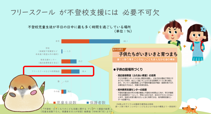 教育支援センター(約15%)やフリースクールなどの民間施設(約18%)も必要不可欠な居場所です