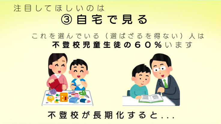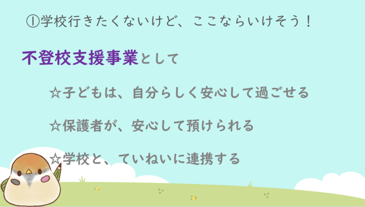 不登校支援事業として、しっかりと位置づけられるようにしていきたいと思っています