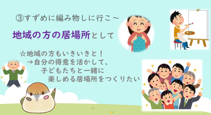 すずめの學校で楽しんでいる地域の方を見て、子どもも一緒に楽しむ→地域の方がもっといきいきとする