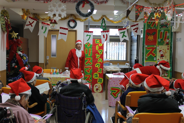 ↑施設の全景と施設内で開催したクリスマス会の様子です!