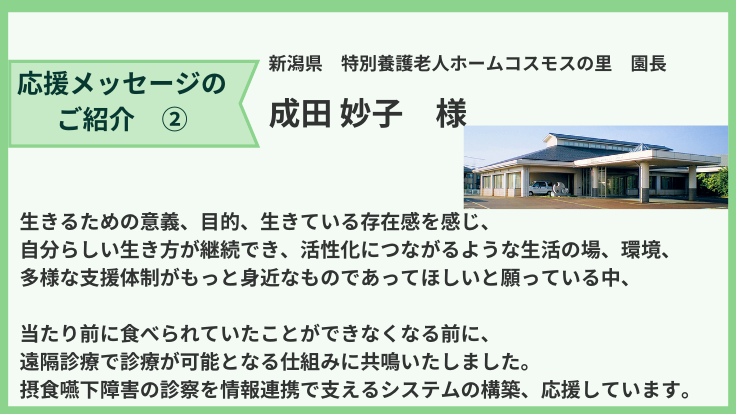 当たり前に食べられていたことができなくなる前に、遠隔診療で診療が可能となる仕組みに共鳴いたしました。摂食嚥下障害の診察を情報連携で支えるシステムの構築、応援しています。