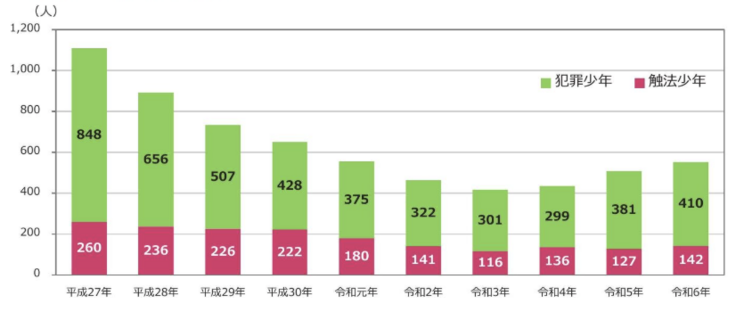 (刑法犯少年:2012年2,069人→2024年552人)
