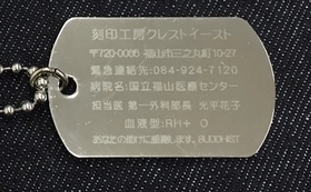 「ドッグタグ」という名前の通り、ペットの犬が迷い犬にならないように、制作する犬のIDタグことです。これを刻印工房クレストイーストでは、今回作成する高齢者用のIDタグや自衛隊モデル(レプリカ)のIDタグの制作を行っています。