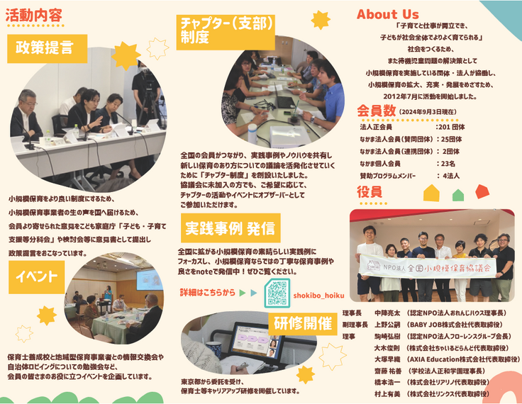 を目的として、2012年7月に活動を開始しました。子どもの最善の利益と施設運営に適切な制度整備を目指す政策提言活動や、小規模保育の普及活動に関する事業を日々行っています。