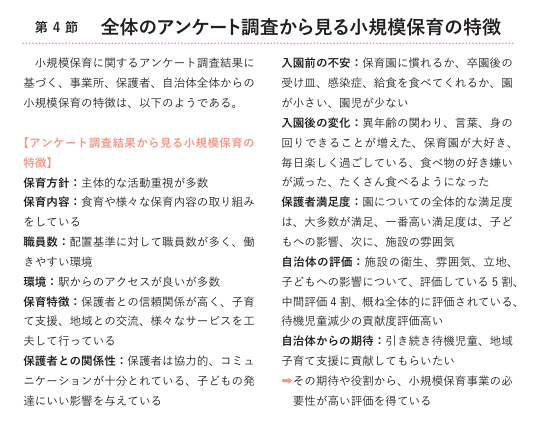 アンケート調査の内容も盛り込み、子育て環境と小規模保育のこれまでやこれからがひとめでわかる白書になっています。