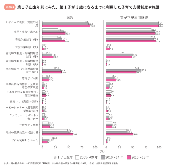 このような子育て事情のなか、2015~2018年生まれの第1子を持つ夫婦の90.3%が子育て支援制度や施設を利用しています。特に「産前・産後休業」「育児休業」「短時間勤務」「認可保育所」の利用率が上昇し、「地域の親子交流・相談の場」は58.0%に達しました。