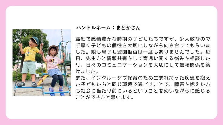 この2冊を通して、これからの子どもたち、地域にとって必要不可欠な保育を提供し続けるためにはなにが必要か、子育て環境をより身近に感じていただき「こどもまんなか社会」をともに考える一助となればと考えています。