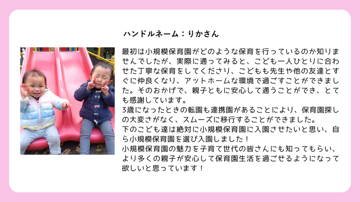 その意味で、小規模保育所は、家庭的な雰囲気、多すぎない人数の他児や保育者との関わりが子どもだけでなく保護者にとっても確かな安心・安定と信頼感を育み、人と関わる心地よさの感覚を身に付けることができるのです。このことは、40年以上にわたって小規模保育所で保育実践をした者としてその重要性を確信するところです。