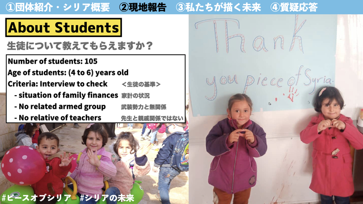 ★オンライン報告会:現地パートナーNGO代表ウサマとオンラインで報告会を実施します(アーカイブ有)。シリアの子どもたちの授業の様子や、子ども達からの感謝のメッセージを動画でお届けします。