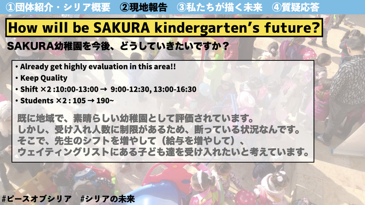 現地で、SAKURA幼稚園は高い評価を得ているのですが、受け入れ人数に制限があり、断らざるを得ない状況にあります。