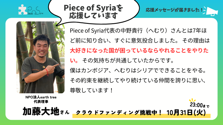 【応援メッセージ】加藤大地さん(NPO法人earth tree 代表理事)