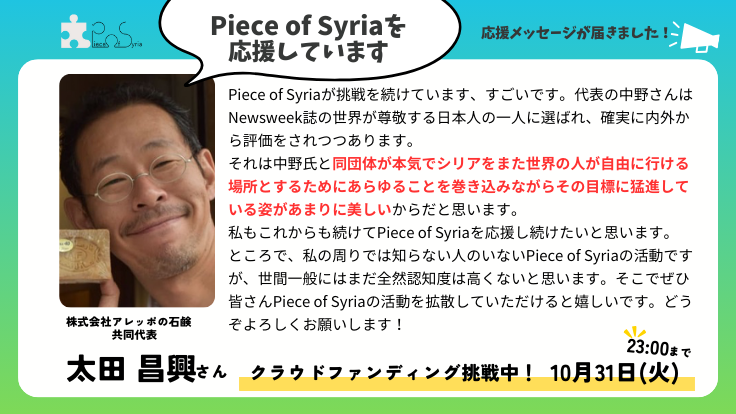 私もこれからも続けてPiece of Syriaを応援し続けたいと思います。