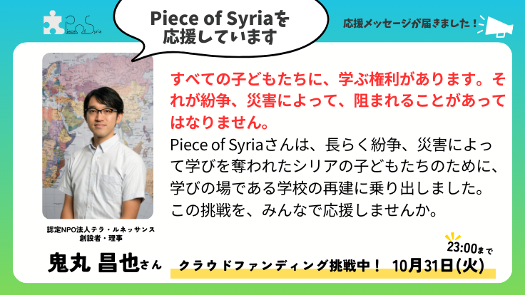 【応援メッセージ】認定NPO法人テラ・ルネッサンス創設者・理事 鬼丸昌也さん