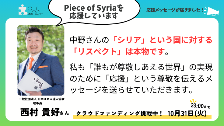 【応援メッセージ】一般社団法人日本ほめる達人協会 理事長 西村貴好さん